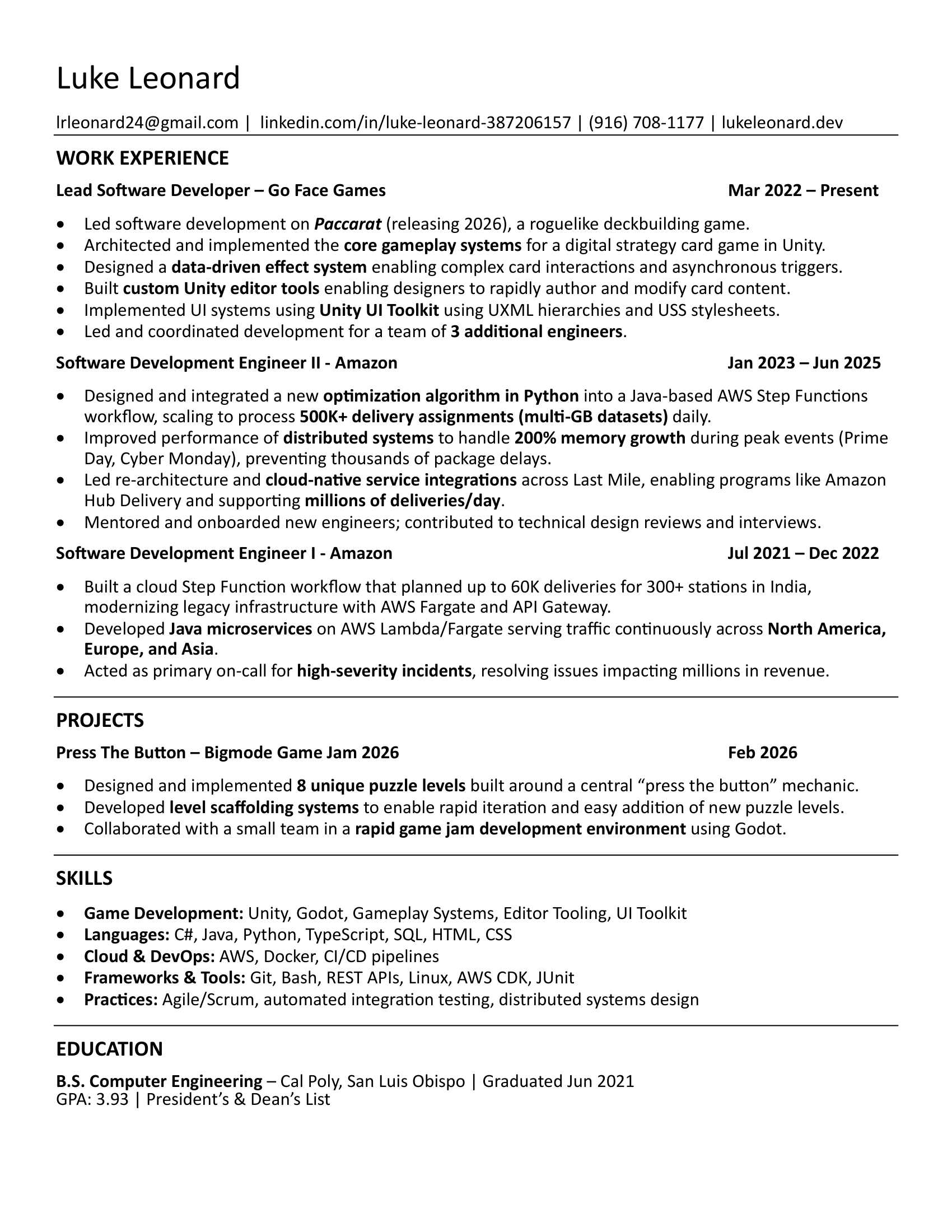 Hi, I'm Luke Leonard, a game developer and software engineer. After spending four years in industry as a software engineer building large-scale distributed systems, I chose to focus on making games, fulfilling the dream I had as a wide-eyed kid who wanted to grow up to be a game developer.