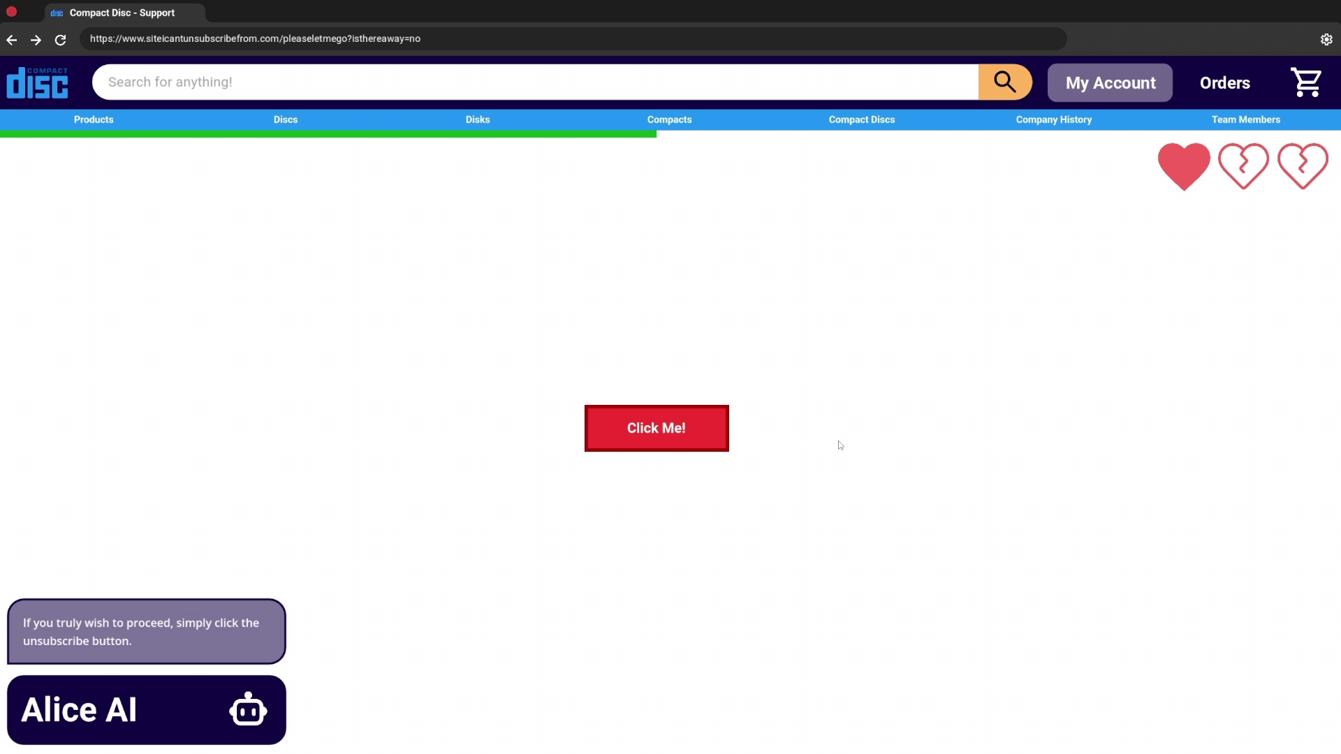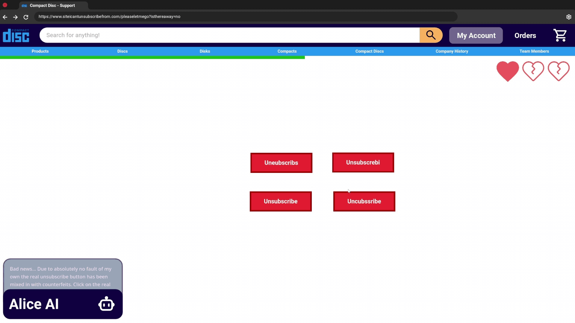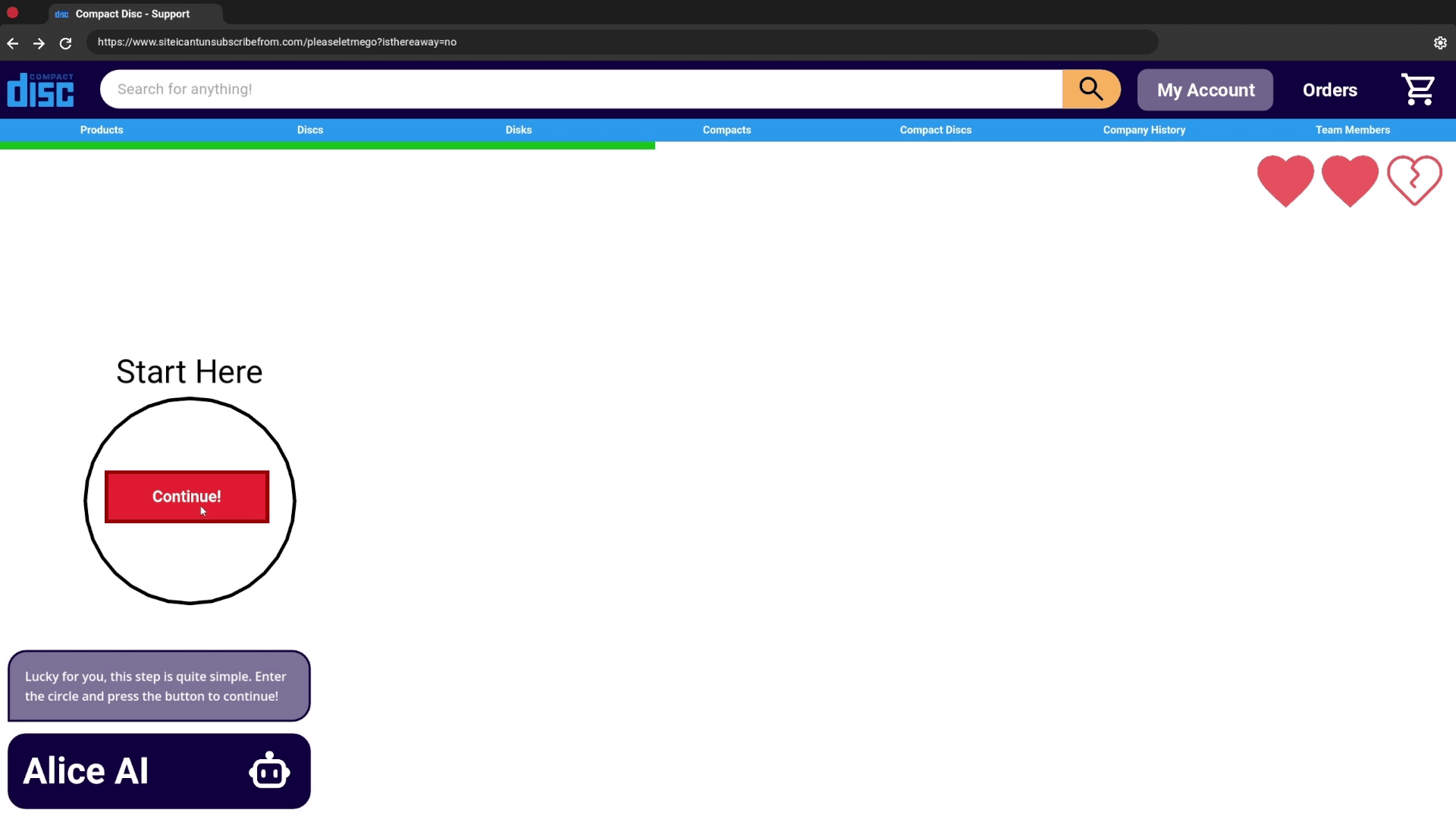 Press the Button is a level-based puzzle game about attempting to unsubscribe from a sutbborn website that does everything it can to prevent you from unsubscribing. Each level presents a different UI interaction puzzle where players must outsmart the site and its AI chatbot to continue through the increasingly convoluted unsubscription process.