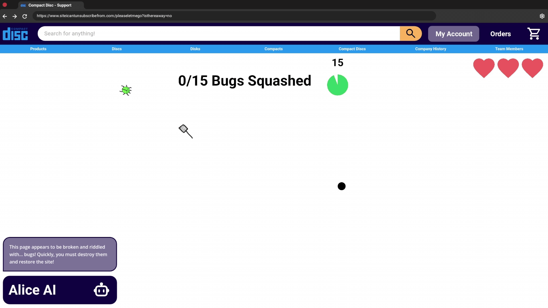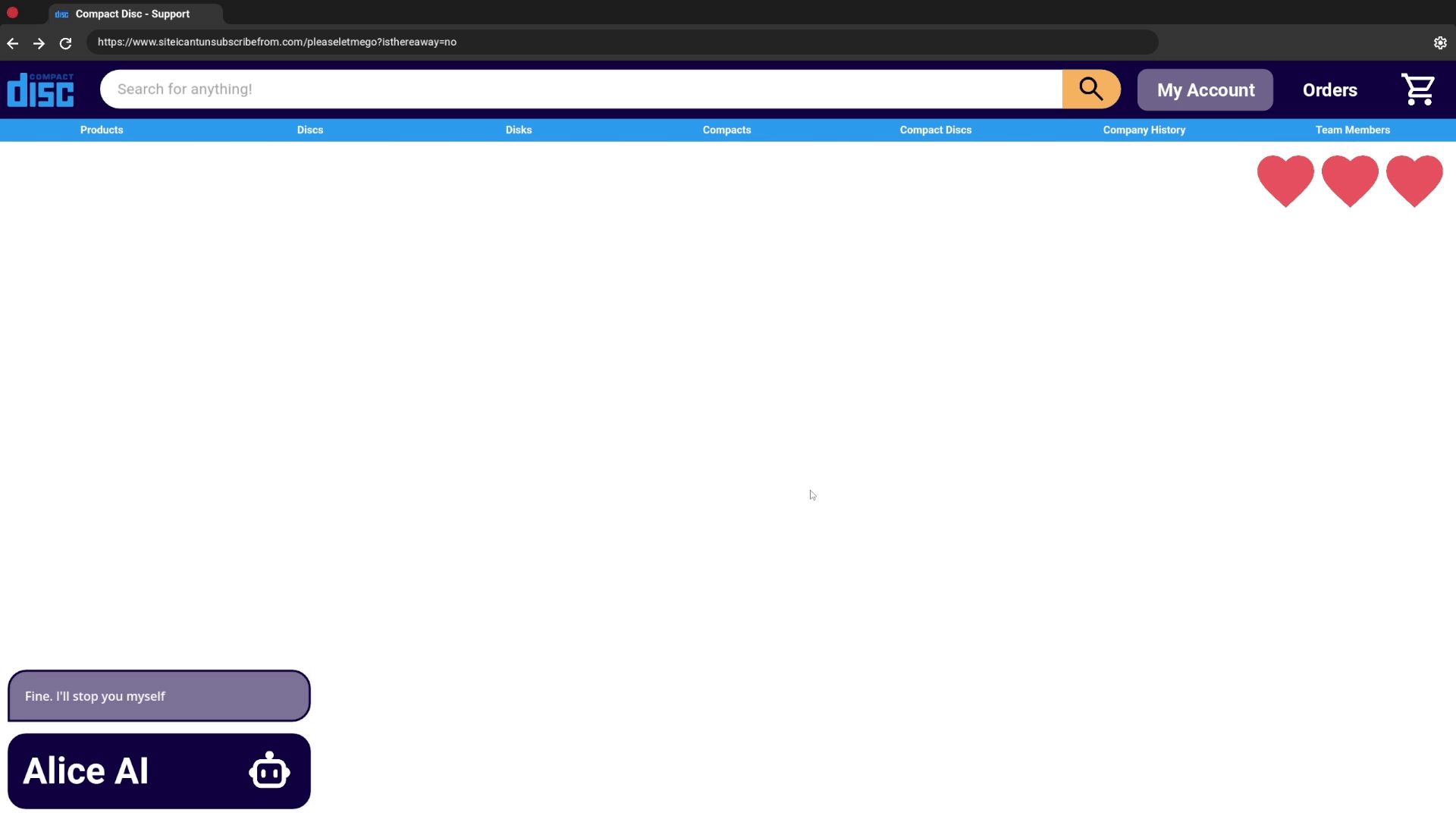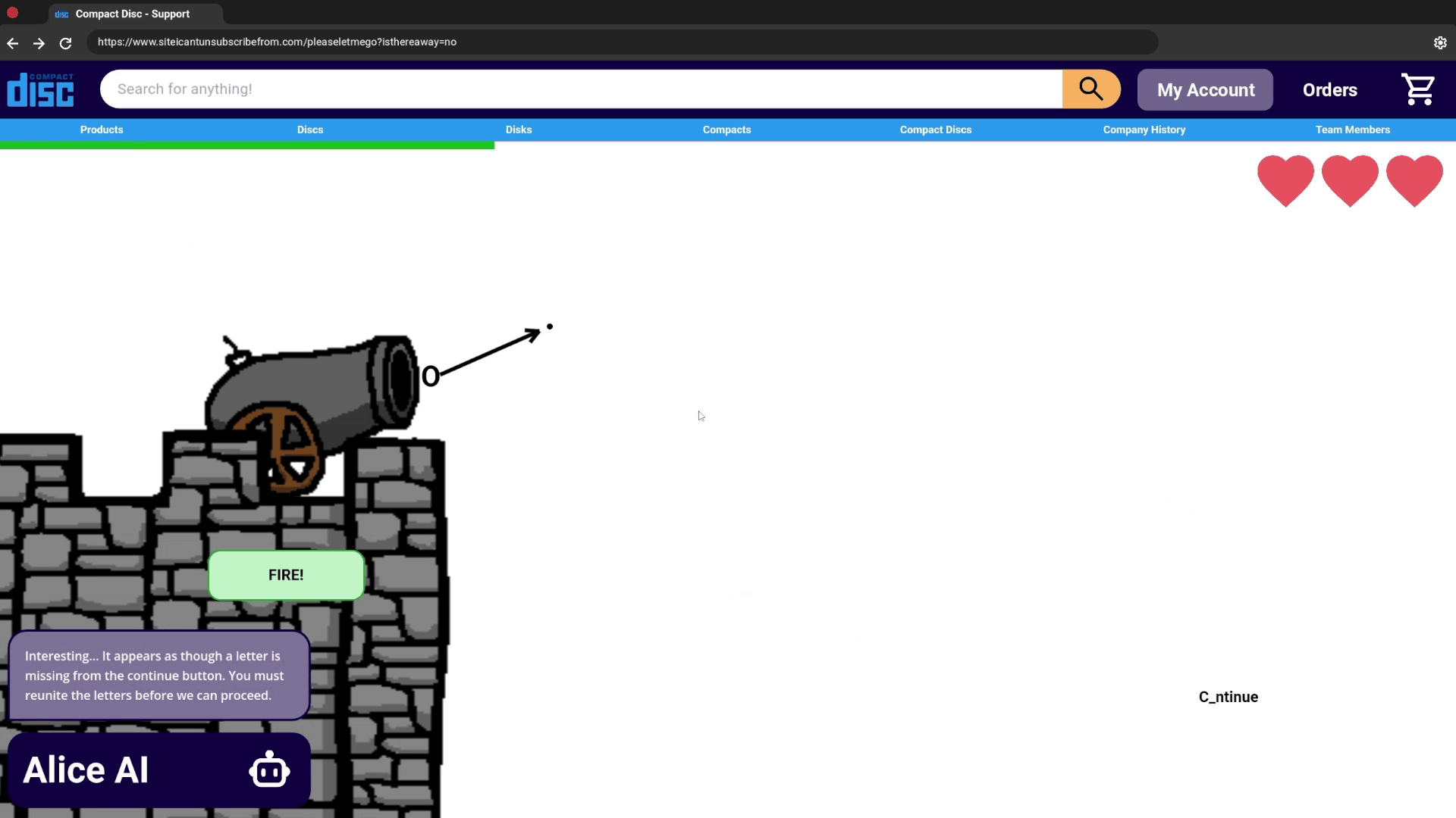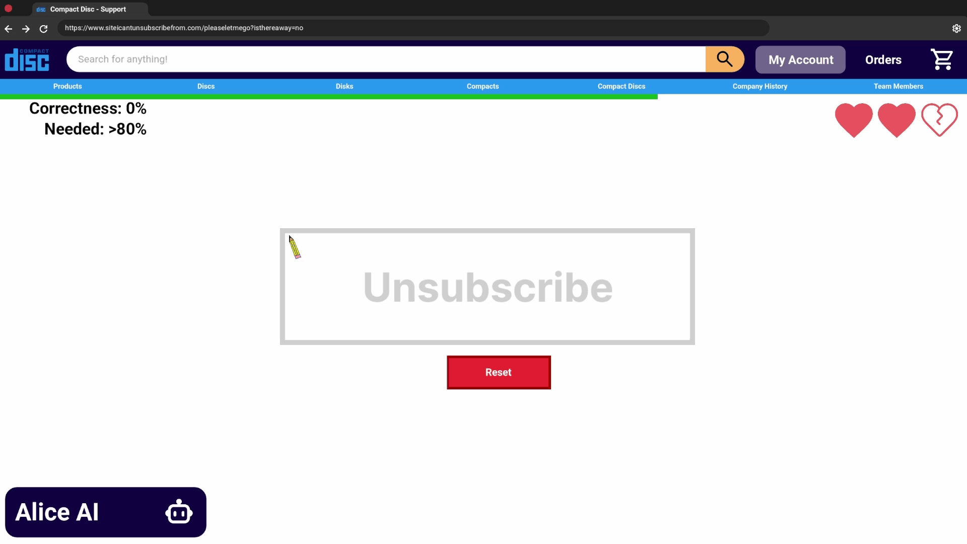 Press the Button is a level-based puzzle game about attempting to unsubscribe from a sutbborn website that does everything it can to prevent you from unsubscribing. Each level presents a different UI interaction puzzle where players must outsmart the site and its AI chatbot to continue through the increasingly convoluted unsubscription process.
